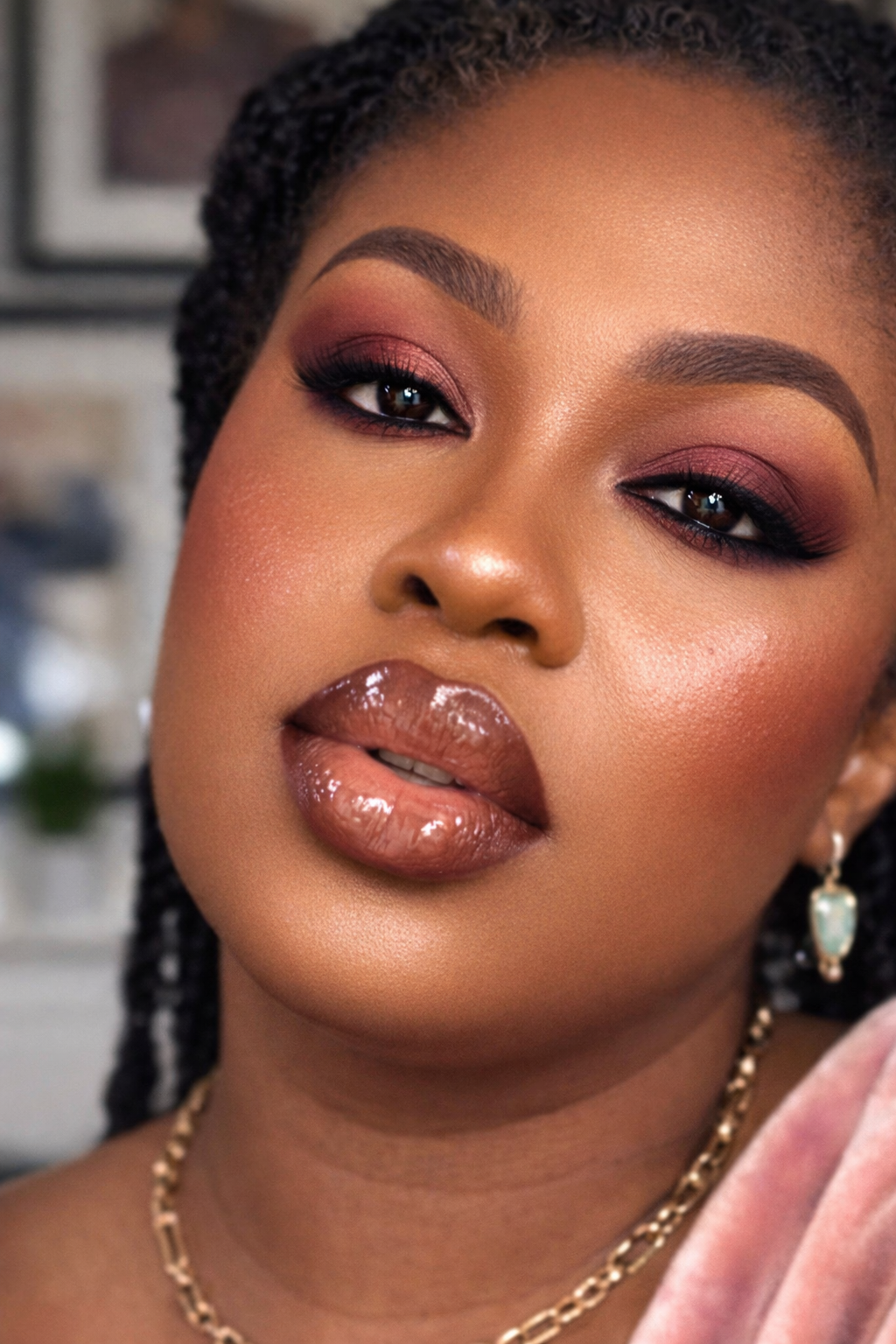 Start with Cuddle — a rich brown with red undertones — to frame the lips. Then for a soft nude matte that ties everything together with a smooth gradient effect, soften the center with Void, a neutral velvet matte lipstick with a pink undetone . Add a layer of clear gloss to lock it in with shine.