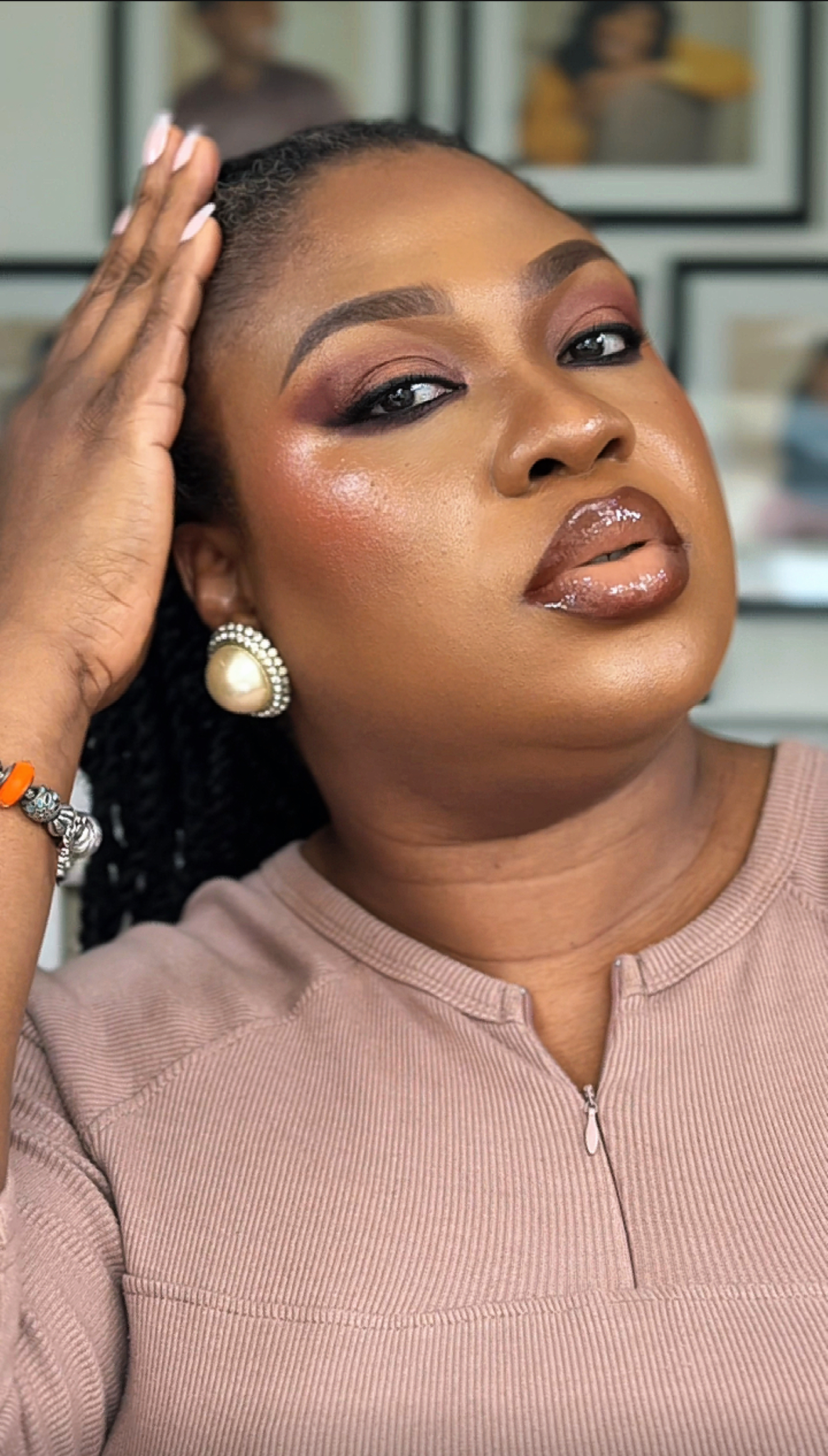 This nude look is all about buildable beauty. You start with Melanin our brown lipstick with red undertones to frame the lips, then layer on with Twist our terracotta gloss for warmth and depth, followed by a light brown gloss to soften and blend the center.